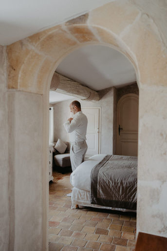 Die Hochzeit fand im Mas de la Rose statt. Die Anlage mit ihren alten Steinbauten, klaren Linien und dem weitläufigen Gelände eignet sich besonders gut für intime Hochzeiten. Der flache Pool wirkt visuell sehr homogen und ästhetisch und fügt sich natürlich in die Umgebung ein.
